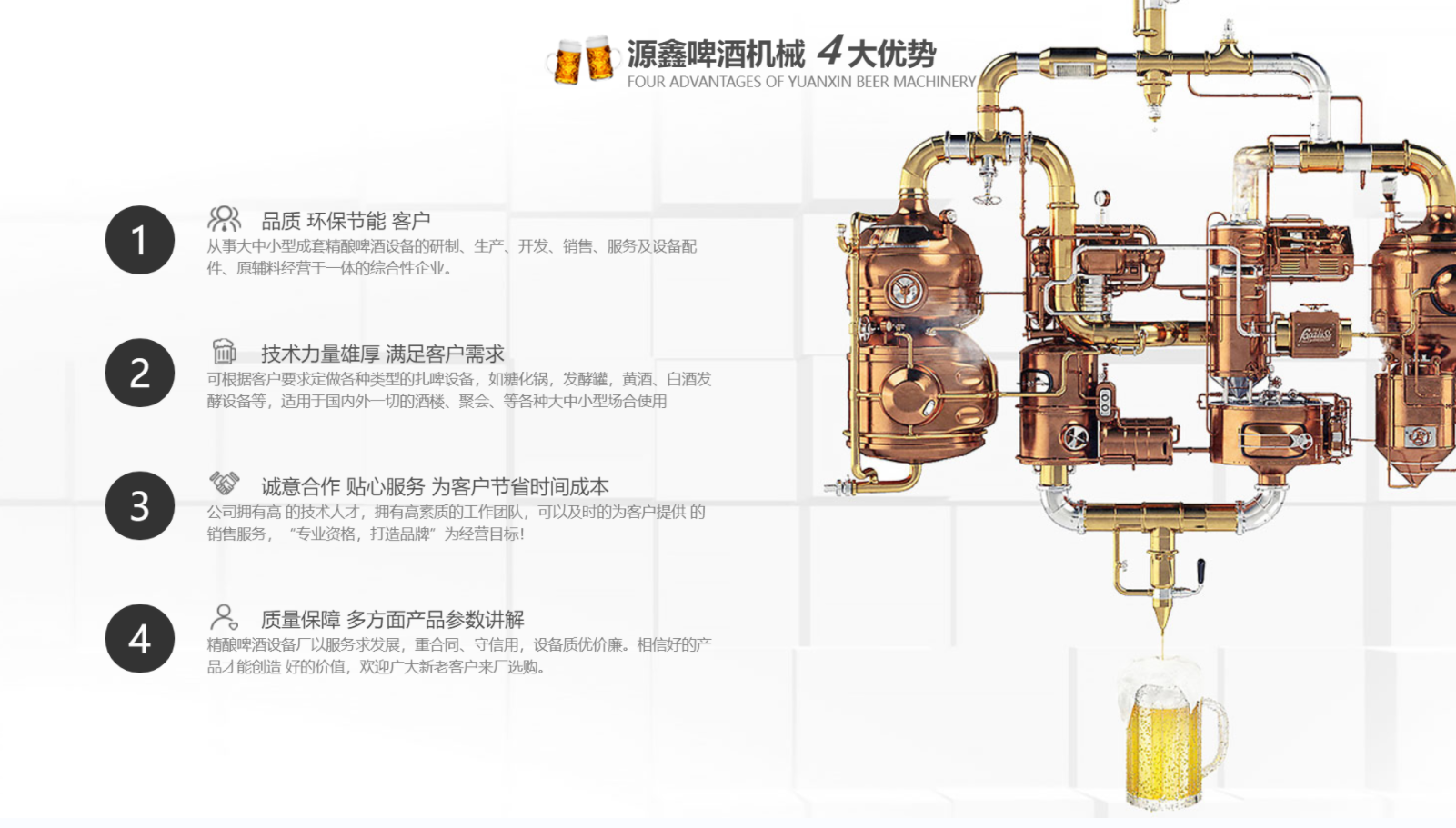 南陽市源鑫啤酒機械設備有限公司位于歷史文化名城一-南陽,從事大中小型成套啤酒、白酒自釀設備的研制、生產、開發(fā)、銷售、服務及設備配件、原輔料經營于一體的綜合性企業(yè)。公司可根據(jù)客戶要求定做各種類型的扎啤設備,如糖化鍋,發(fā)酵罐,黃酒、白酒發(fā)酵設備等,適用于國內外一切的酒樓、餐廳、家庭.聚會、酒吧等各種大、中、小型場合使用。公司擁有技術人才,擁有高素質的工作團隊,可以及時的為客戶提供**的銷售服務。公司以“專業(yè)資格,打造品牌”為經營目標,“卓越質量,信賴價格”為經營宗旨,以質量求生存,以服務求發(fā)展,重合同、守信用,設備質優(yōu)價廉。相信好的產品才能創(chuàng)造 好的價值,歡迎廣大新老客戶來廠選購。...